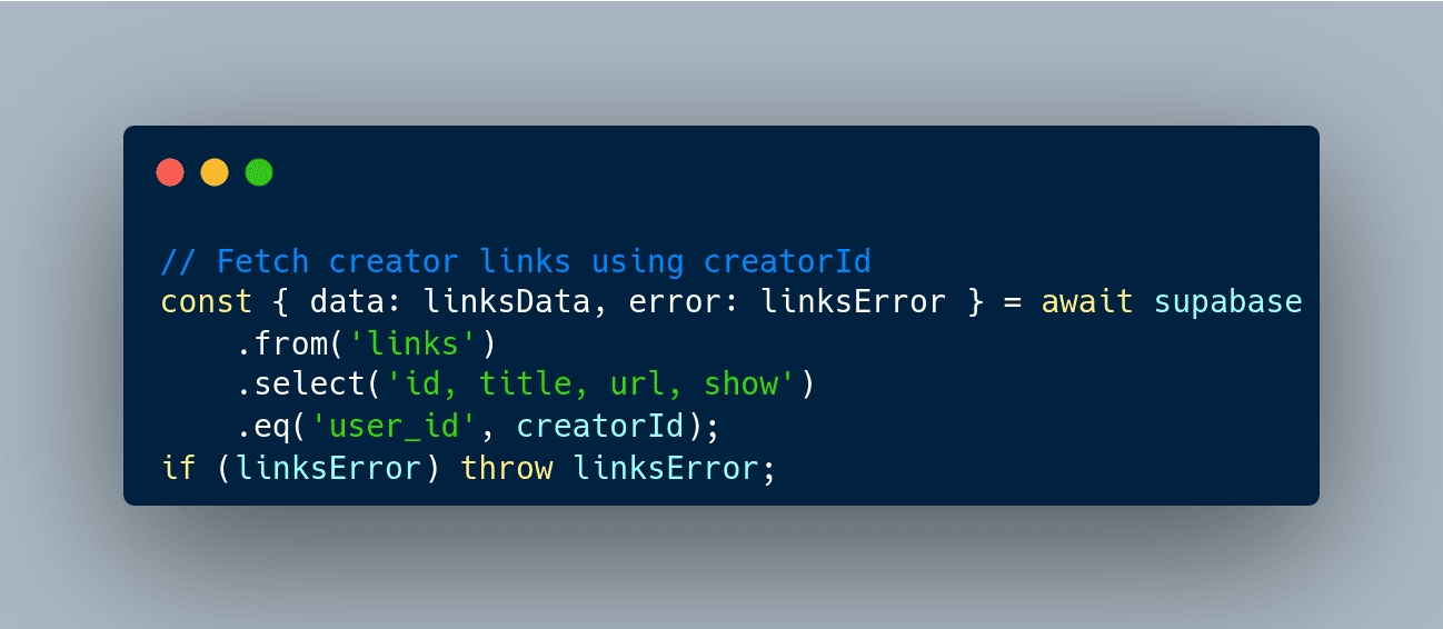 The documentation is also pretty nice in my opinion and the usage is pretty straightforward. Here's an example of fetching creator links using creator ID from Supabase database: